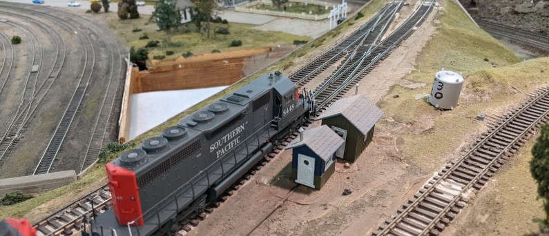 Once I learned Jim was having issues there, my first reaction was to try different trains to replicate the problem and identify some kind of pattern. Our track cleaning engine EMDX 1201 has no trouble going over it, nor do the automated trains. Maybe it’s a load issue… I tried to replicate the issue using two UP SD70s there with a long train, and could not replicate the problem. However once, just once, I got the 1201 engine to do a short stop-and-go hesitation there. Yet, very interestingly, the issue has been consistently reproducible with these SP SD40s, and I finally got to be on the spot to see the problem in action. I was eager to be able to reproduce it… not only is this turnout really hard to reach making it nearly impossible to get the train out of it, it is also a very important part of the automation so I need trains to run flawlessly over it.