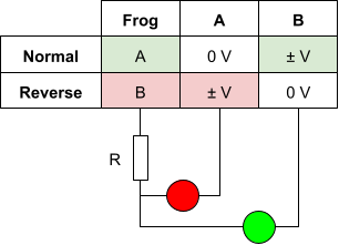 We can directly wire two LEDs, green and red, with a resistance, to the frog and the A / B rails to get them illuminated to indicate the position of the turnout, as follows: