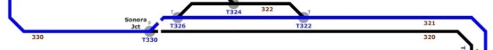 On the layout, operators typically run from right to left on this section of the track. A very common error is for operators to forget to align their turnouts and then be surprised when their train shorts or derails. These two event lines fix that: when a train is on block B320 (right) and block B330 after the turnout is empty, the Sonora turnout can be automatically aligned towards the incoming train on B320. Same pattern for a train coming from B321.