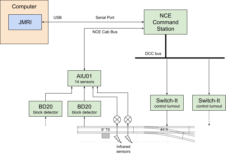 Automating a model railroad requires three different aspects: sensors to detect the train, control of turnouts, and a way to connect all these to a computer running the control software. Here's a schematic overview of the system used on this layout:
