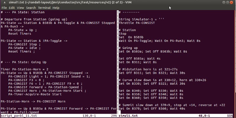 For ease of developing and testing, the Conductor app also has a second custom language to simulate the automation. This simulates the progression of the train through the layout, simulating the activation of track occupancy sensors as if the actual engines were moving along.