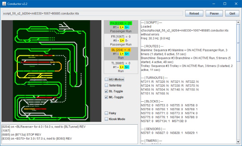 The Conductor app is invoked from JMRI using its Jython extension bridge. Conductor’s main role is to run a script that drives the automation. It uses an event-based language created for that purpose that updates turnouts and engines in reaction to a combination of sensors and timer inputs. Sensors can be either activation buttons or track occupancy sensors defined in JMRI. Depending on the state of the automation and the location of the engines, the script can change their speed, change the lights, blow the horn, set turnouts as required. It is essentially a fully automated DCC cab.