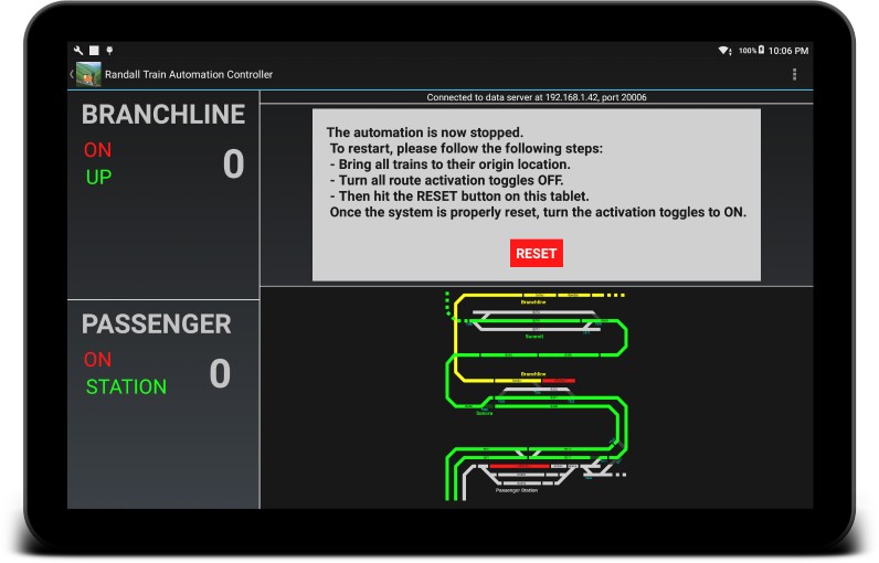 - RTAC features an “Emergency Stop” which users can use to stop the automation, for example if a train derails. Once the Conductor software goes in emergency stop, the tablet can be used to reset the system with some clear indication on screen of what to do.
