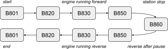 Since this is a “shuttle” sequence, the train goes through each block twice, once in forward and then later in reverse. Thus the sequence graph has two nodes for each block -- the script actions are attached to the nodes, and are thus different when the train first goes through a block and later comes back through that same block.
