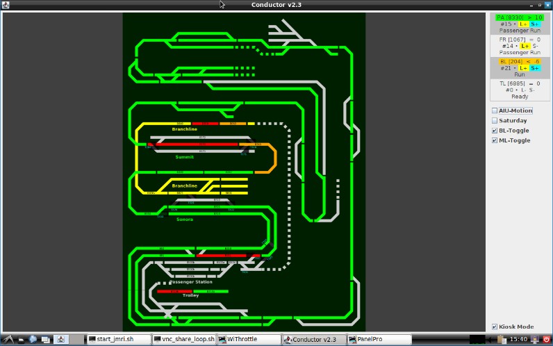 Conductor v2 runs as an extension to JMRI. The interface is a full-screen “kiosk” display of the track with the state of the sensors and the controlled trains: