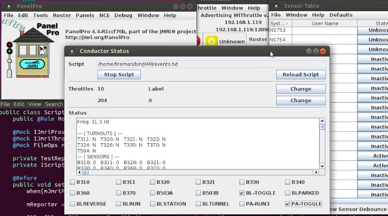 - It has access to the turnouts, sensors and throttles defined in JMRI.